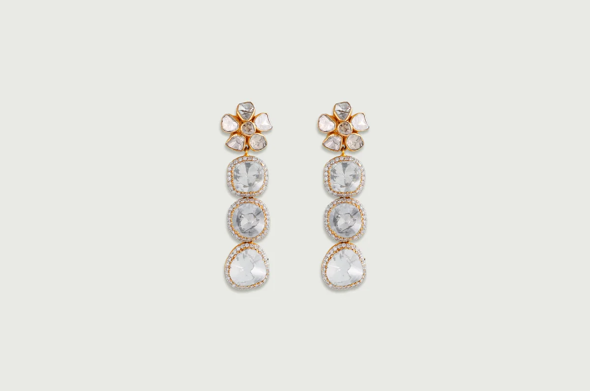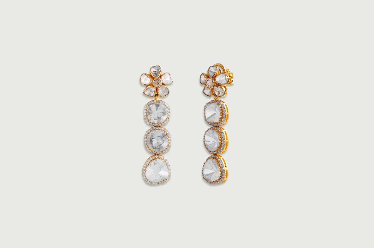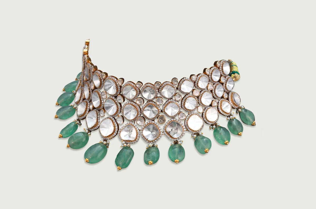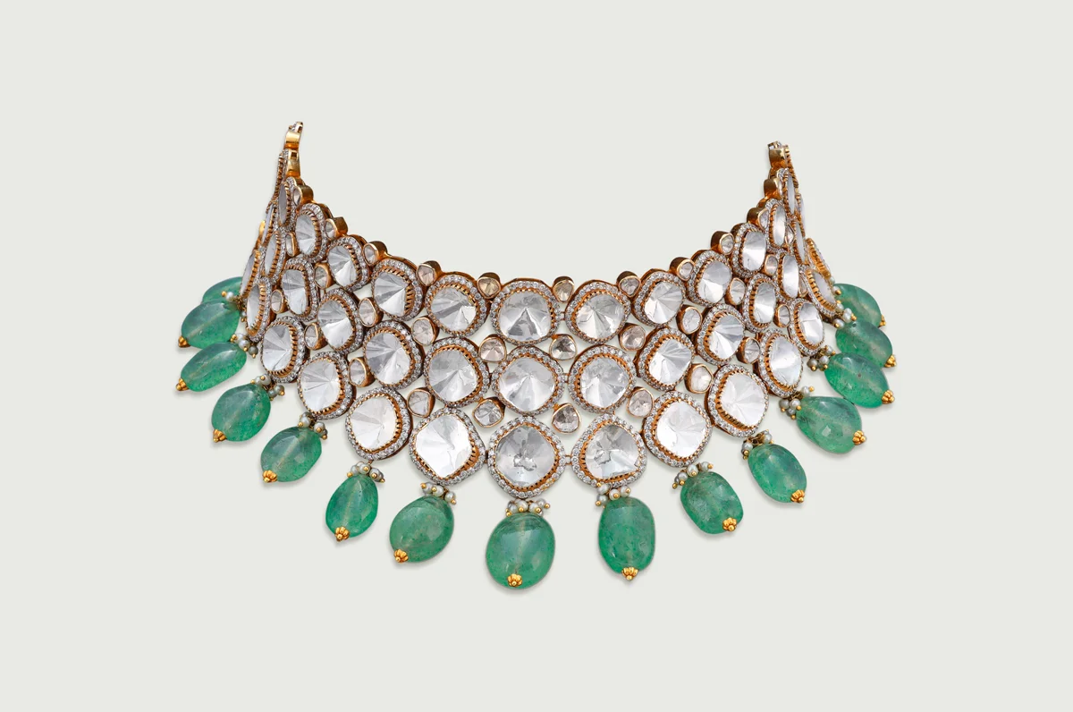 Clusters of lab-grown Polki form a layered crest around the neckline, opening into cascading emerald tumbles that add softness and movement. The interplay of high-polish gold and open-setting Polki creates depth, luminosity and a regal presence.