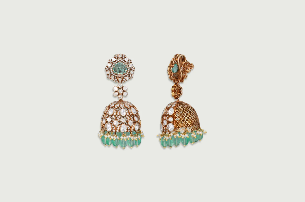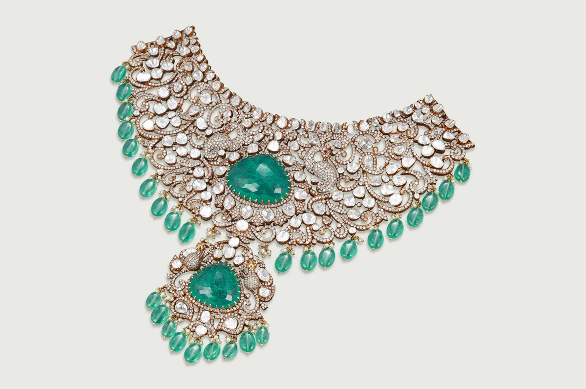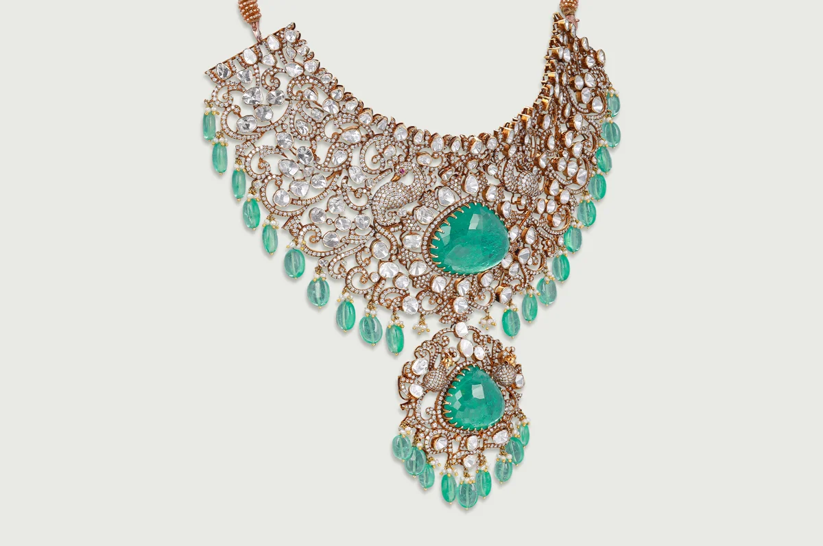 Intricately sculpted Polki motifs flow into peacock-inspired forms, centred with a striking lab-grown 55 Carat Faceted Russian emerald that anchors the composition with depth and colour. The detailed goldwork, paired with cascading emerald beads, creates a fluid movement and a luminous, heritage-inspired finish.