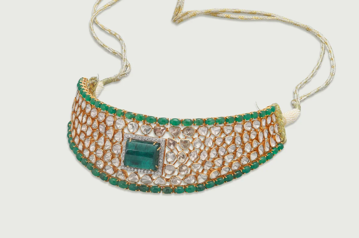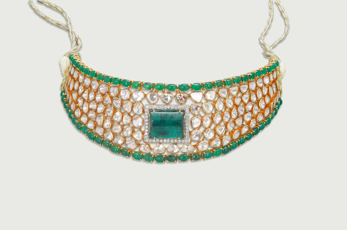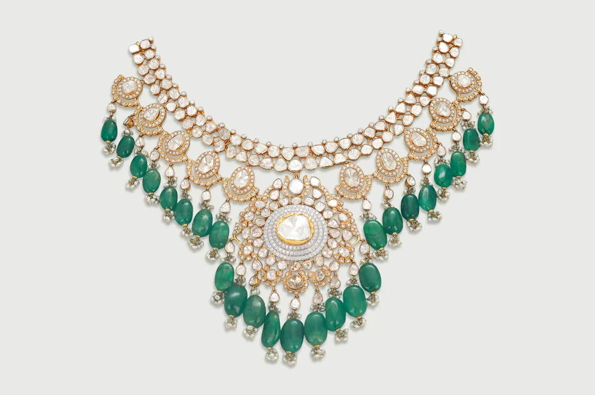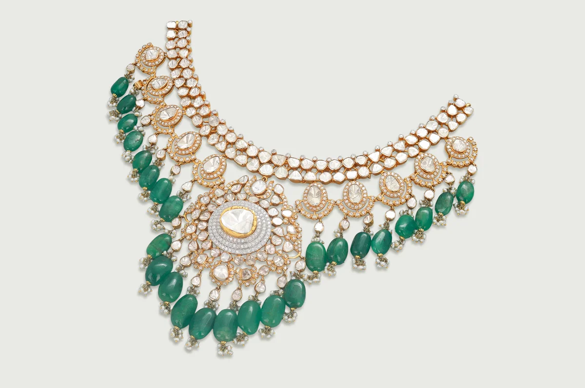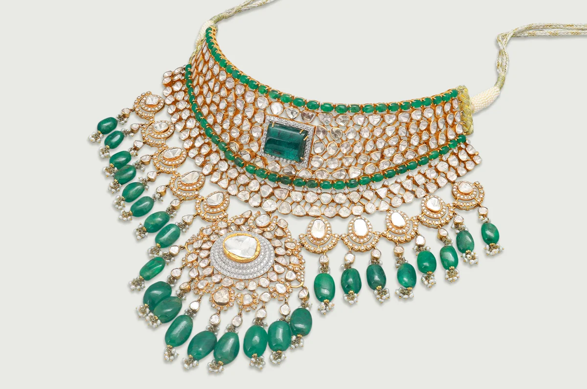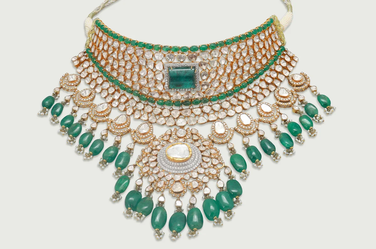 Polki clusters are arranged in layered symmetry, flowing into emerald drops that add depth, movement and ceremonial radiance. The central medallion and upper choker detach to create multiple silhouettes; from grand bridal splendour to refined evening elegance.