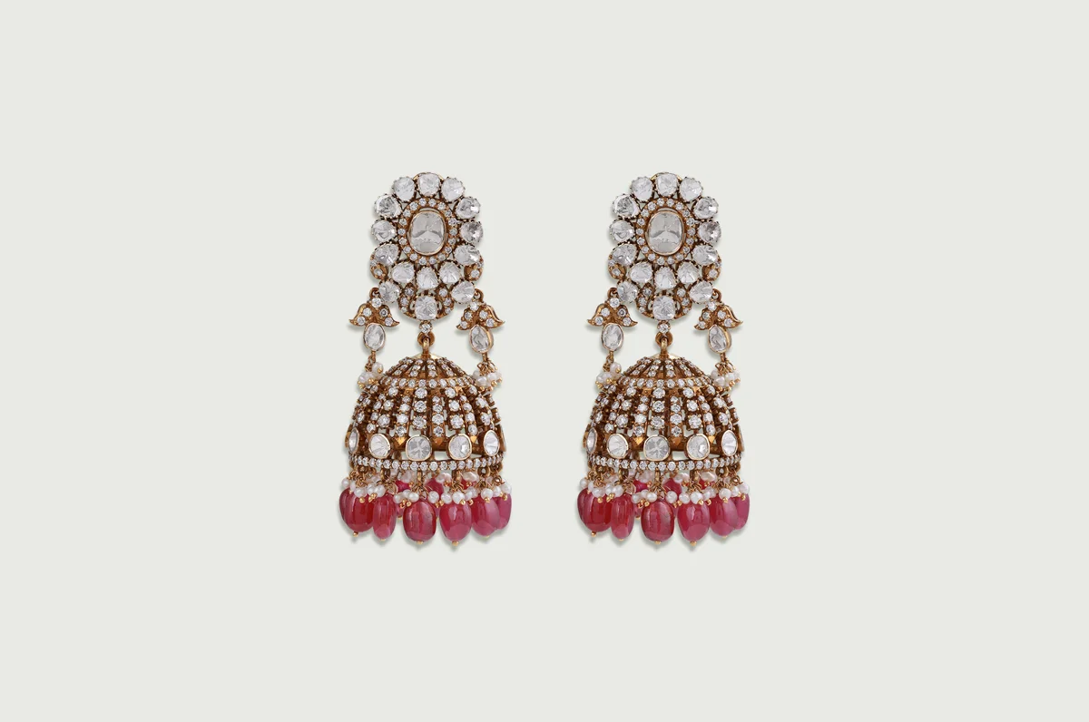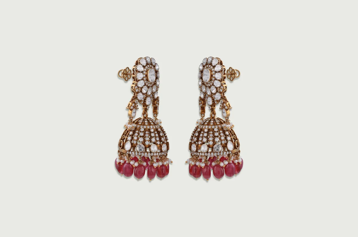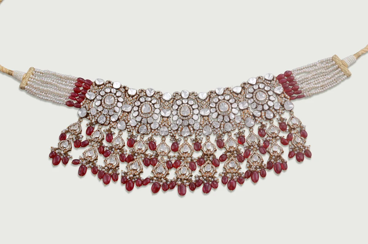 Rows of Polki rosettes flow into intricate ruby drops, each element linked through delicate goldwork that moves with a gentle sway. The multi-layered fringe adds richness and a refined sense of grandeur across the neckline.
