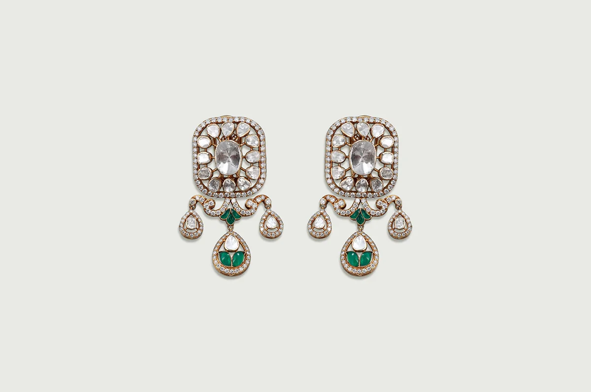 A detailed interplay of Polki clusters, emerald accents and ornamental scrollwork creates a bold architectural profile. The Victorian finish softens the gold, giving the piece an aged patina reminiscent of treasured royal archives.