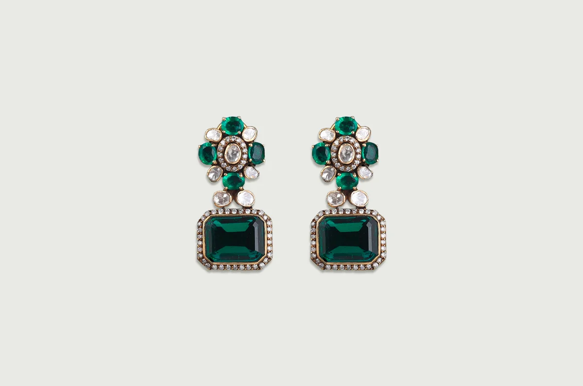 Two cascading rows of lab-grown Polki and deep emerald gemstones create a structured yet fluid drape. The central emerald tablet anchors the composition, framed with diamonds that radiates soft, uninterrupted sparkle.