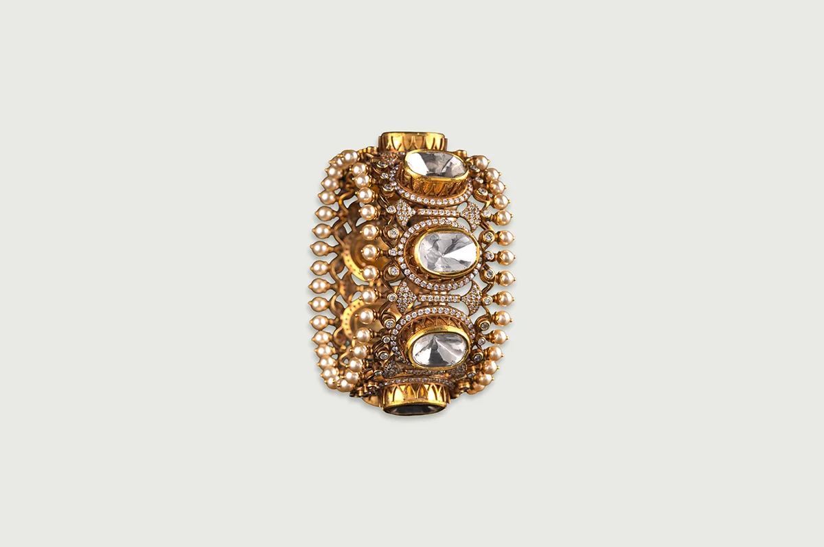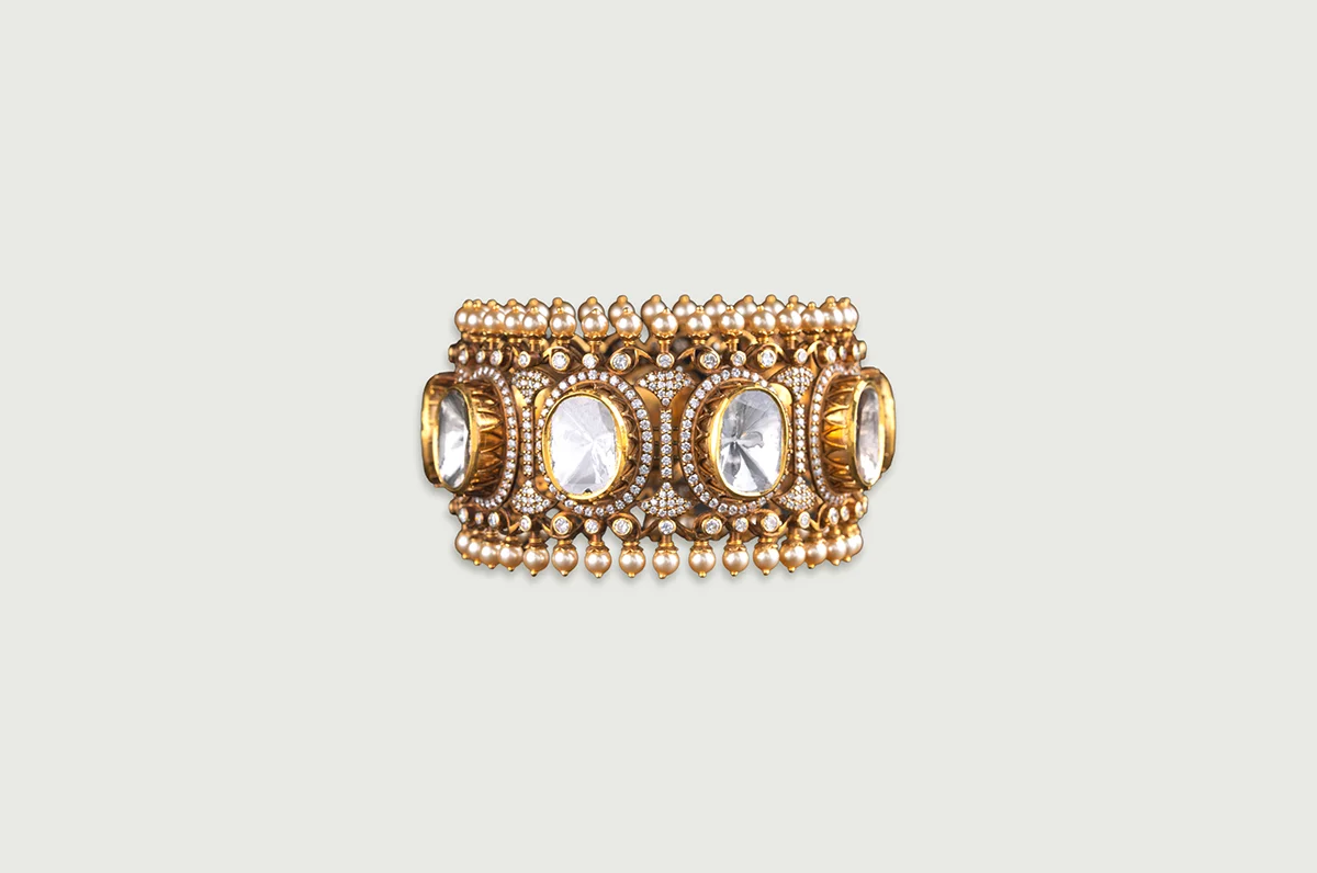 Oversized open-set Polki ovals sit within a layered grid of gold and fine detailing, creating a dimensional, ceremonial presence.