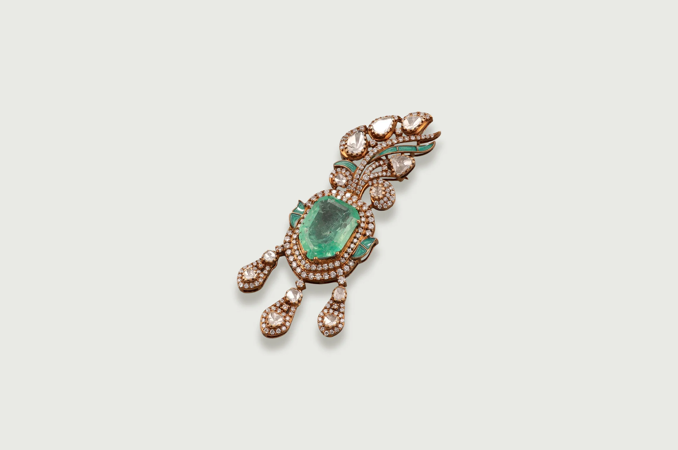 Designed in the divine silhouette of Lord Krishna, this brooch places a lab-grown emerald at its centre — artistically crafted to depict the serene facial outline of the deity. Surrounding Polki-inspired detailing frames the emerald like a miniature temple, blending traditional Mughal motifs with Carbon’s contemporary precision.