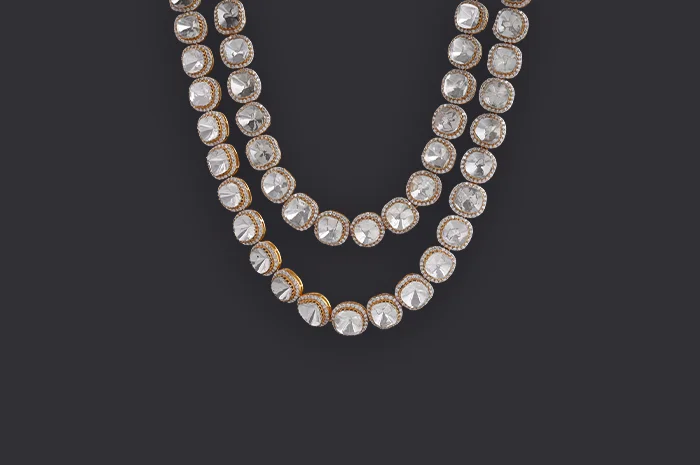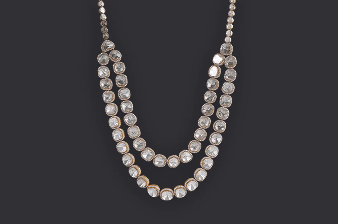 Twin rows of Polki diamonds are set in an open-setting technique, allowing light to pass freely and magnify their natural fire. A contemporary interpretation of heritage craft, where transparency becomes elegance and brilliance feels infinite.