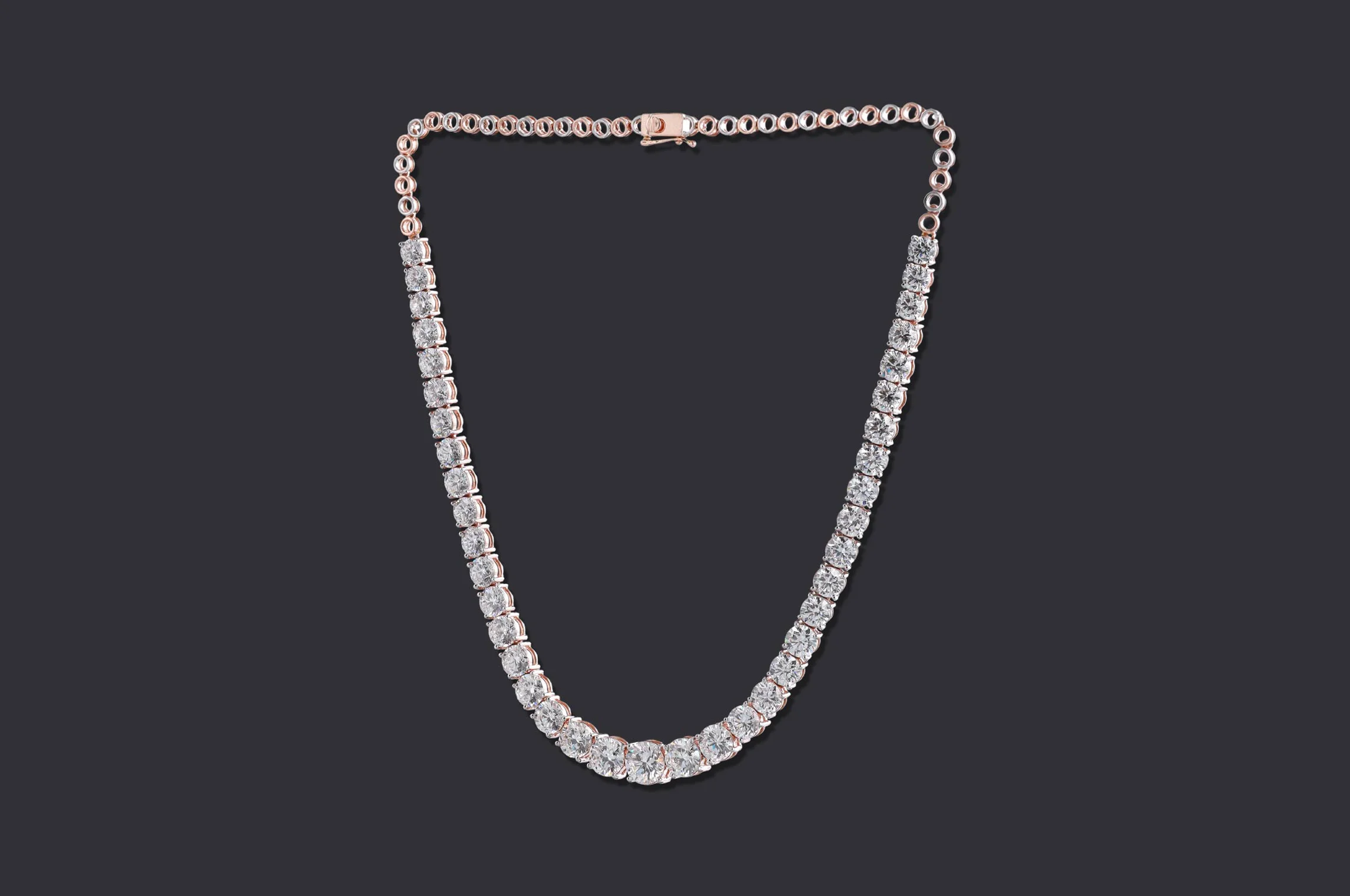 Graduated round brilliant-cut diamonds flow seamlessly along a rose-gold base, paired with timeless solitaire studs. Four-prong secure setting with delicate articulation for fluid movement. Synonymous with red-carpet glamour, the tennis necklace becomes your signature evening piece. With matching studs, this set ensures every entrance feels like a celebration.