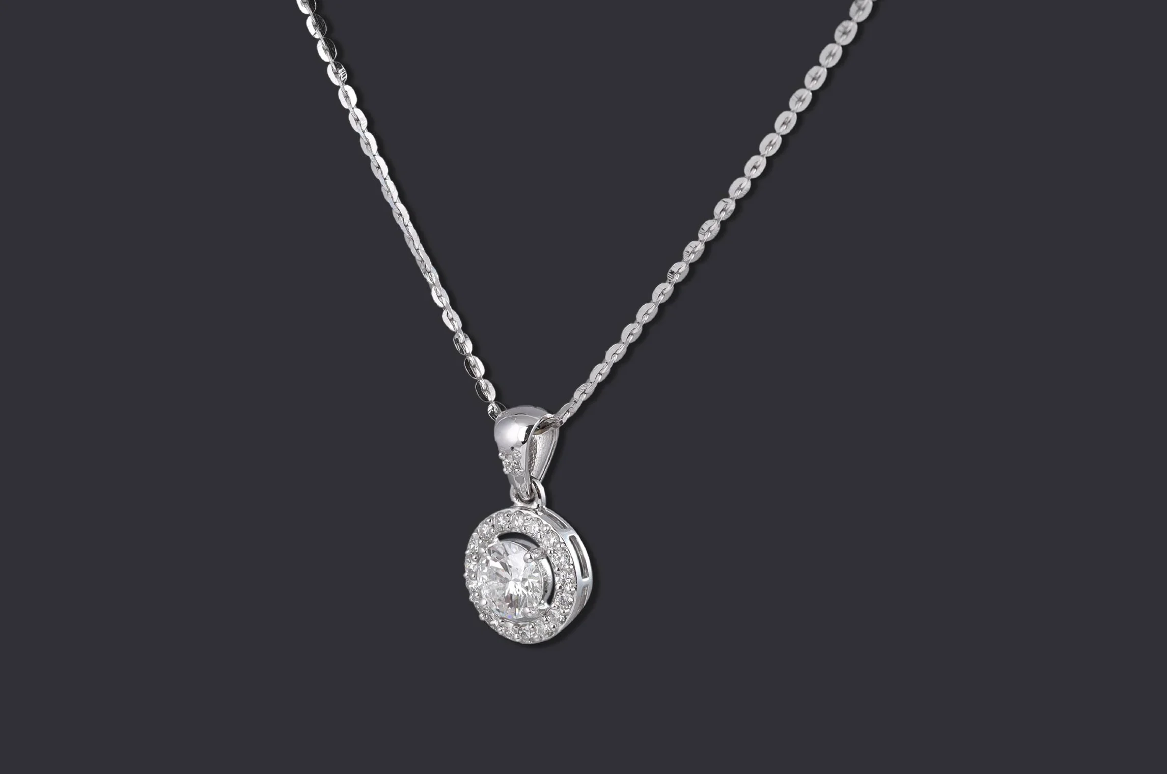 An round-cut solitaire framed with a diamond halo, set in white gold. Timeless in design, this pendant blends everyday versatility with lasting brilliance, making it an office staple that transitions seamlessly into evening sophistication.
