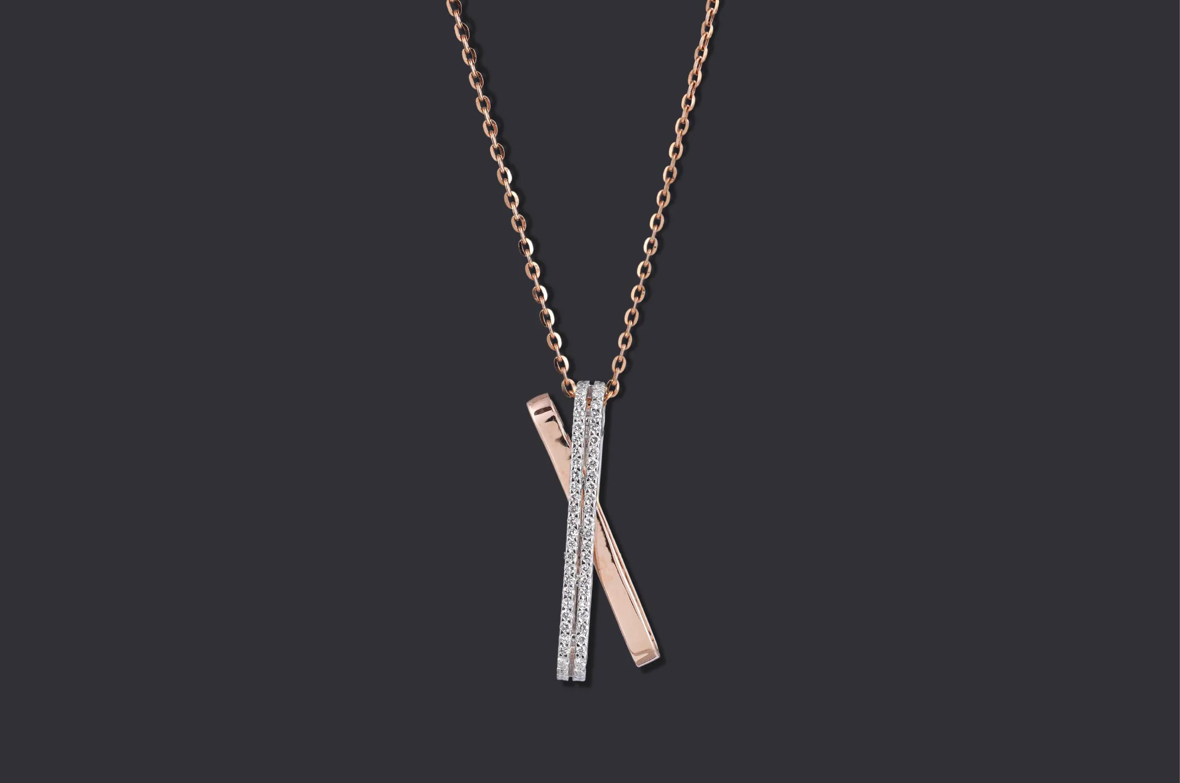 A contemporary pendant crafted with interlacing white-gold and rose-gold bars, one fully pavé-set with diamonds. Modern, sleek, and versatile, it reflects the meeting of strength and elegance; an understated statement for the modern professional.