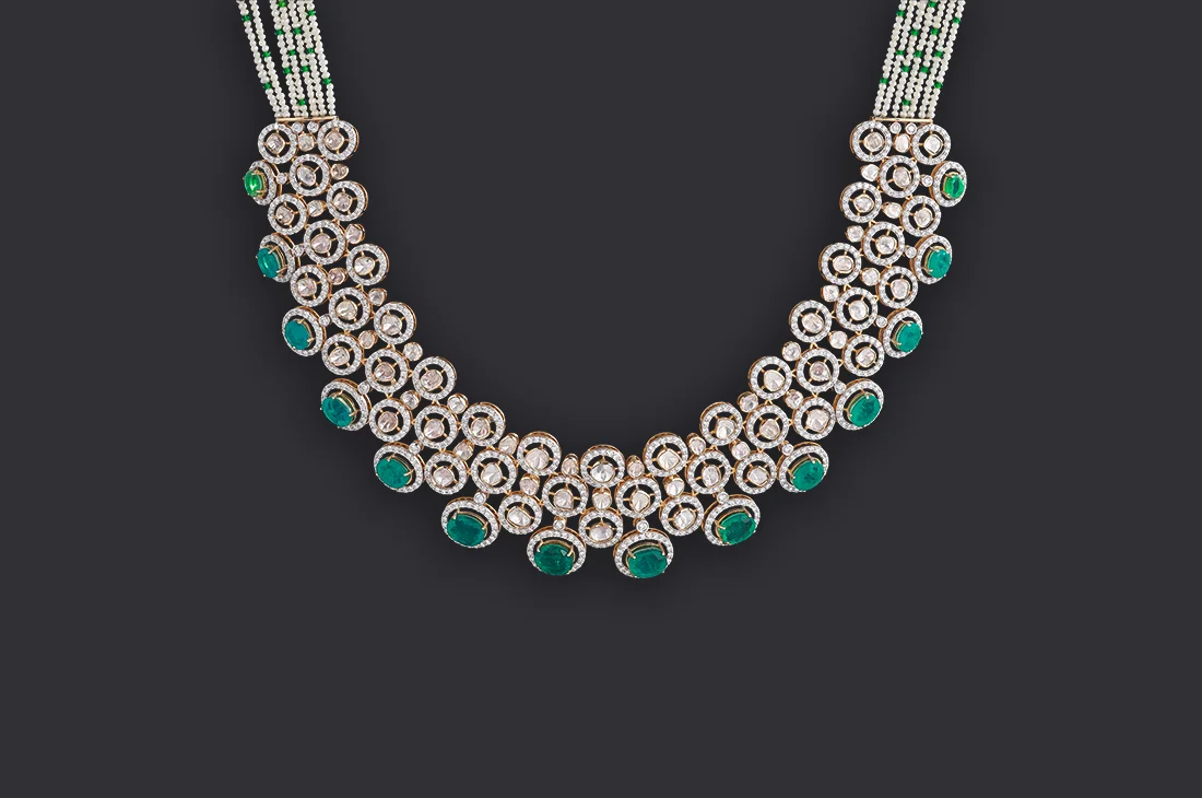 Circular Polki diamonds alternate with vivid emerald, radiating in Geometrical and symmetrical formations. Each unit is finely finished and strung with precision, making the piece a testament to detail-driven craftsmanship.