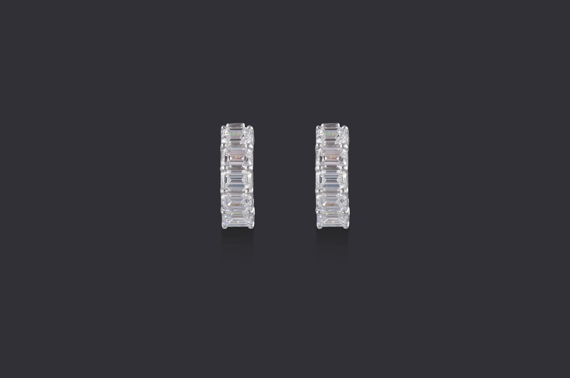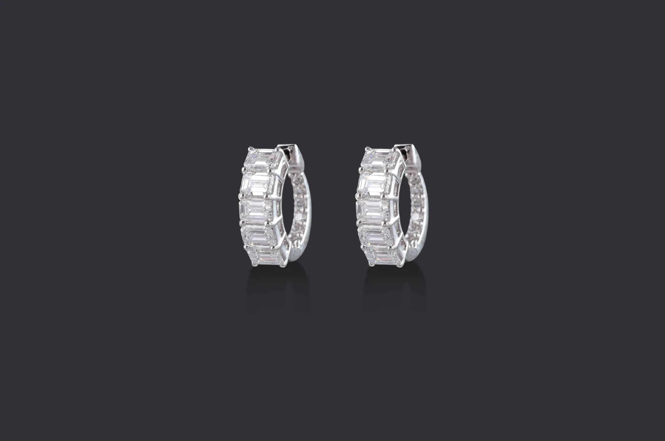 A statement redefined; these contemporary hoops are lined with perfectly aligned emerald-cut diamonds in shared prong setting, creating a seamless wall of brilliance. Bold yet refined, they lend a confident architectural edge to everyday dressing.