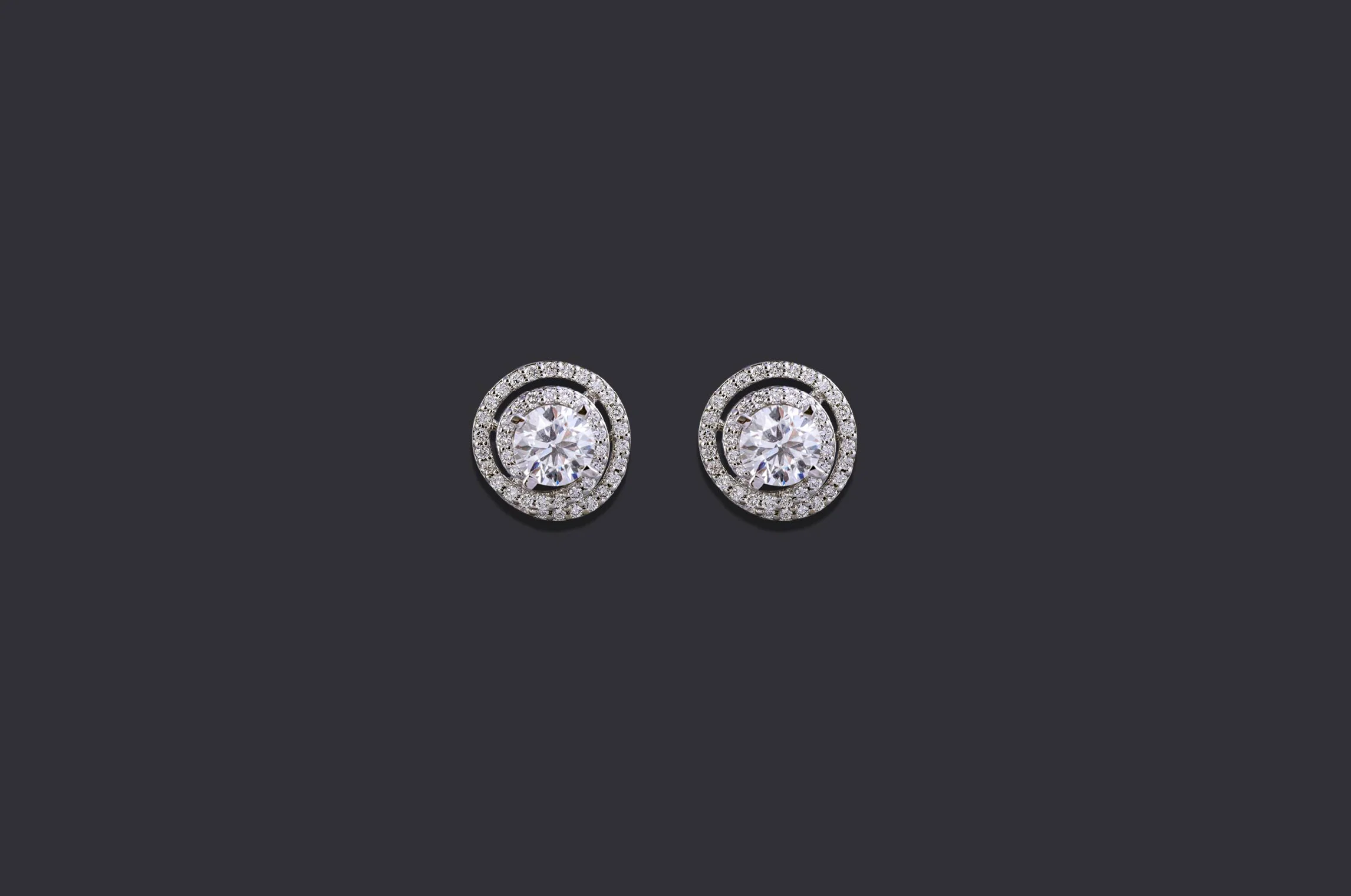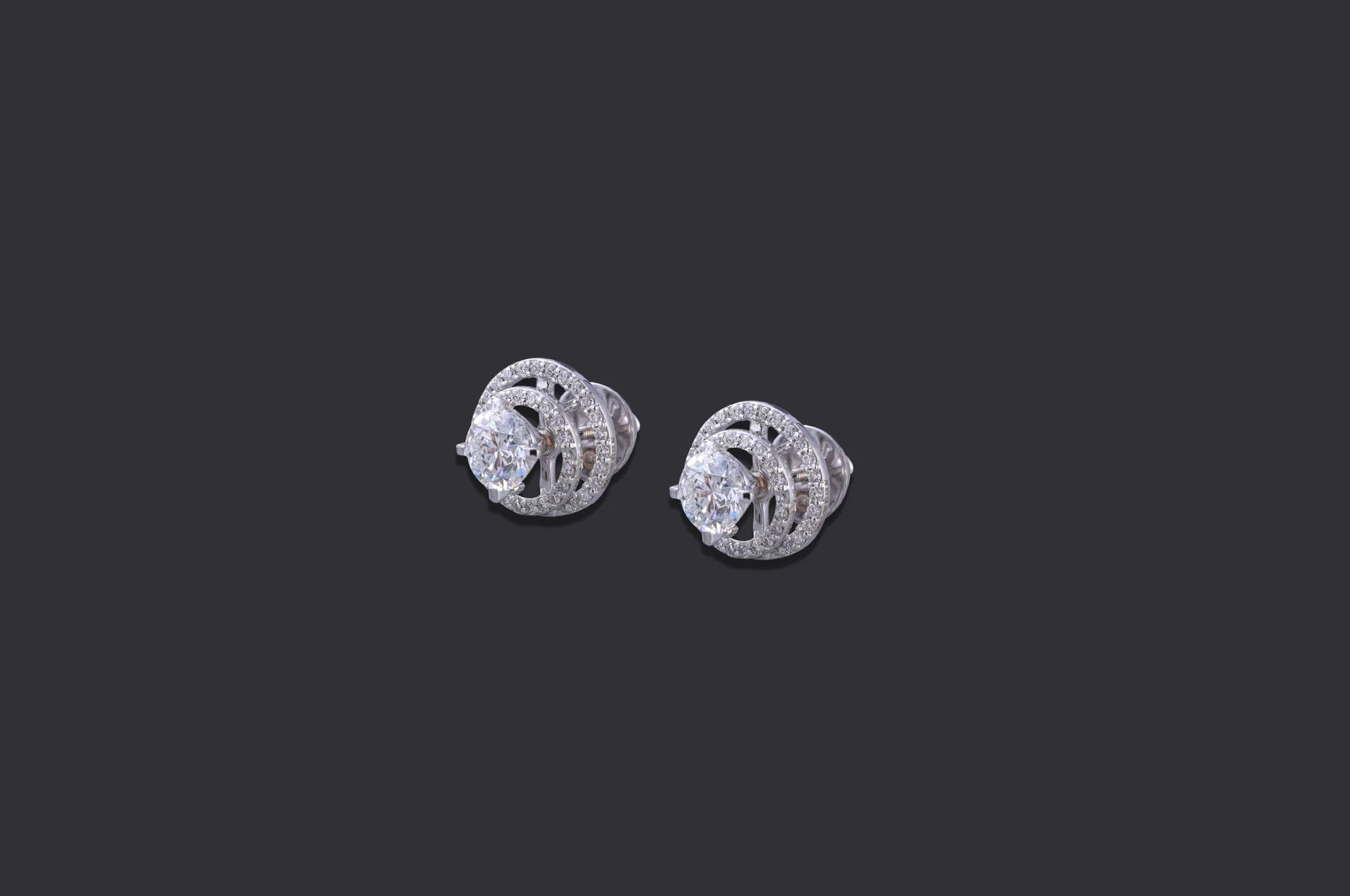 Round diamonds encircled by concentric pavé halos in white gold create a cosmic sparkle, reminiscent of celestial orbits. A modern take on the halo, these studs bring depth and dimension, elevating daily wear with radiant light.