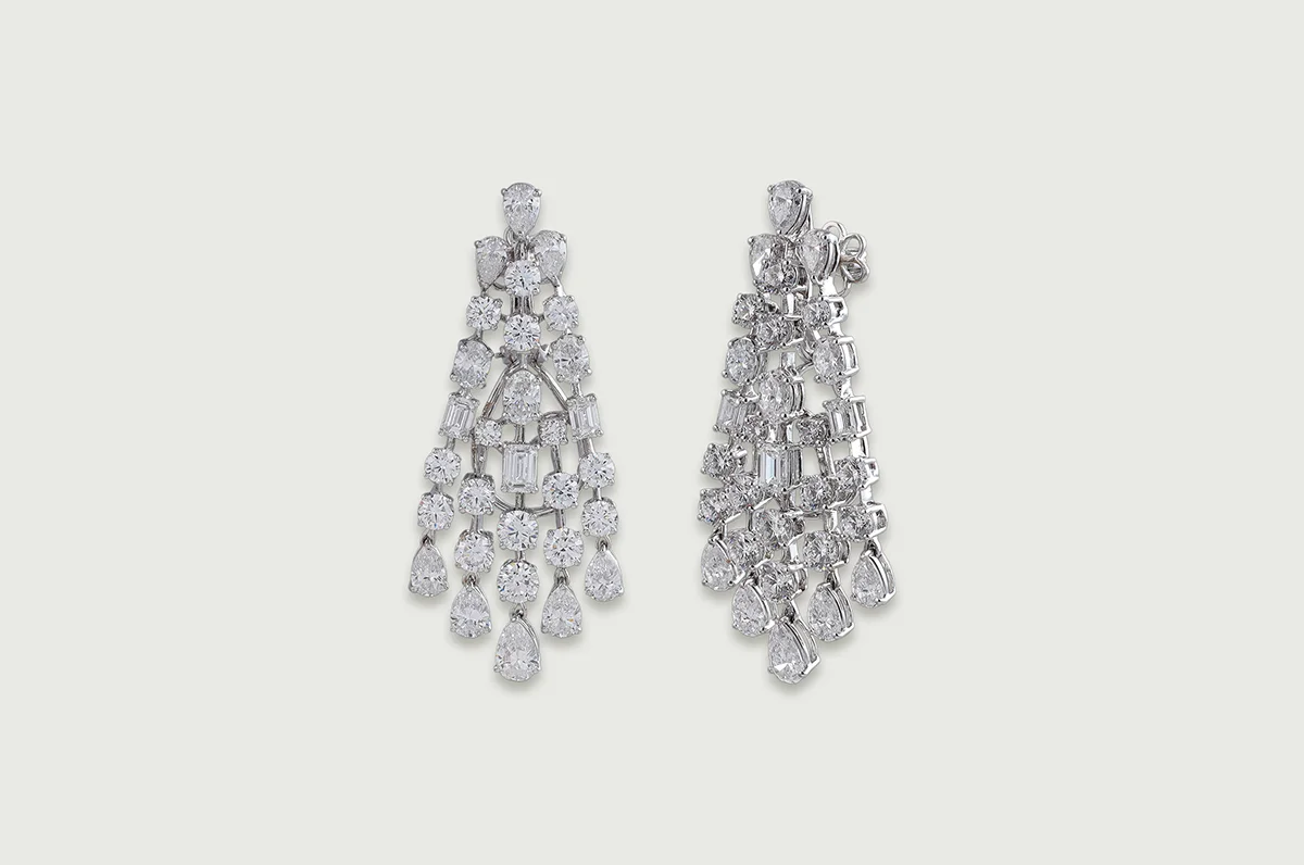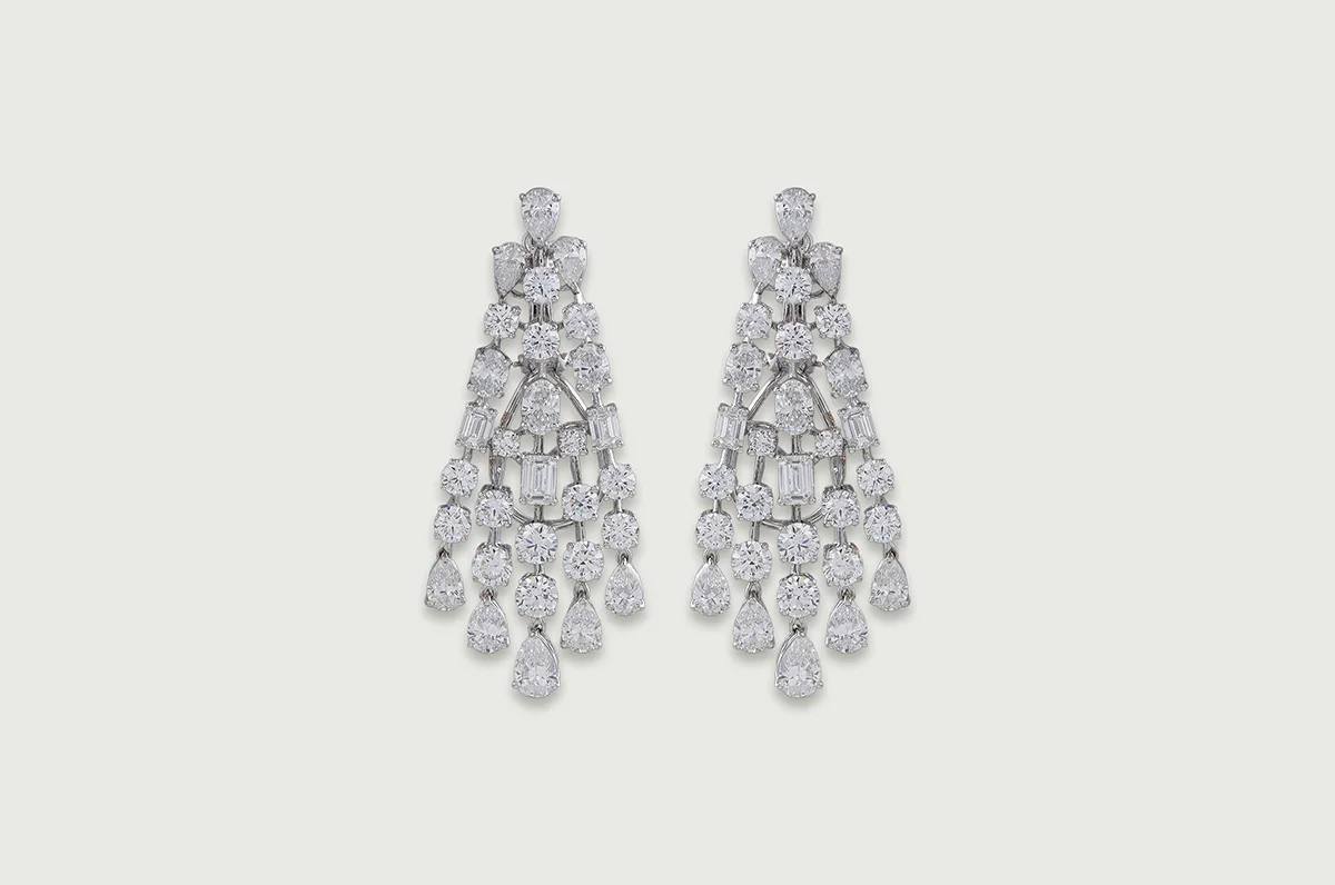 Inspired by the delicacy of taar kaam, each element is linked with fine, thread-like connectors that allow the diamonds to move softly and fluidly.
