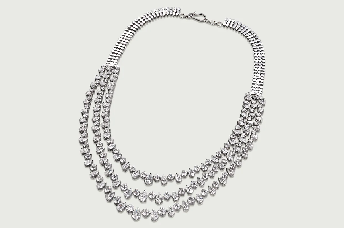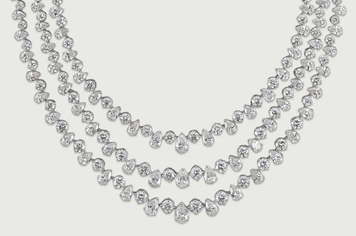 Three fluid rows of pear-cut and round-cut lab-grown diamonds fall in gentle succession, creating a soft gradient of brilliance across the collarbone.