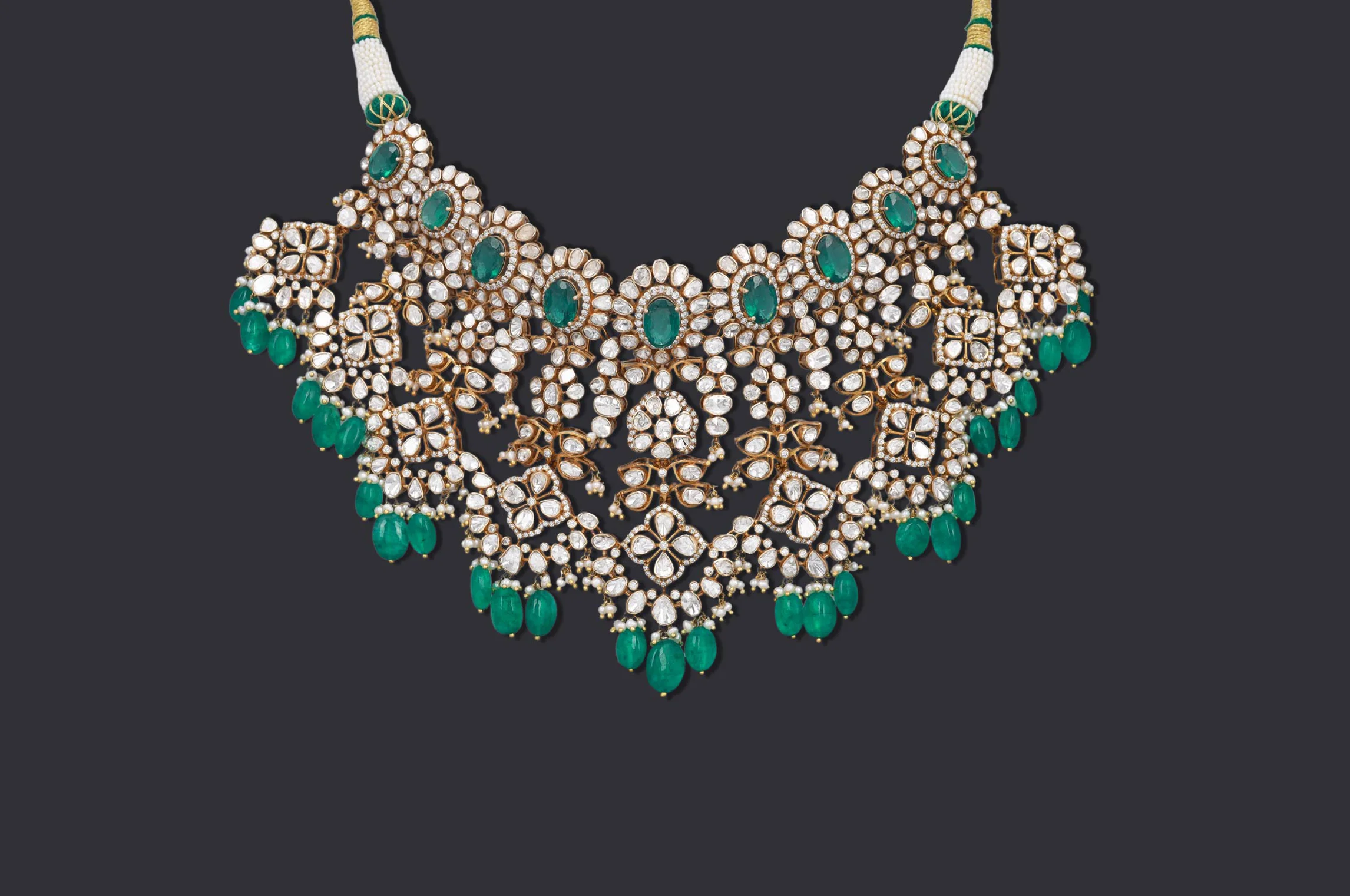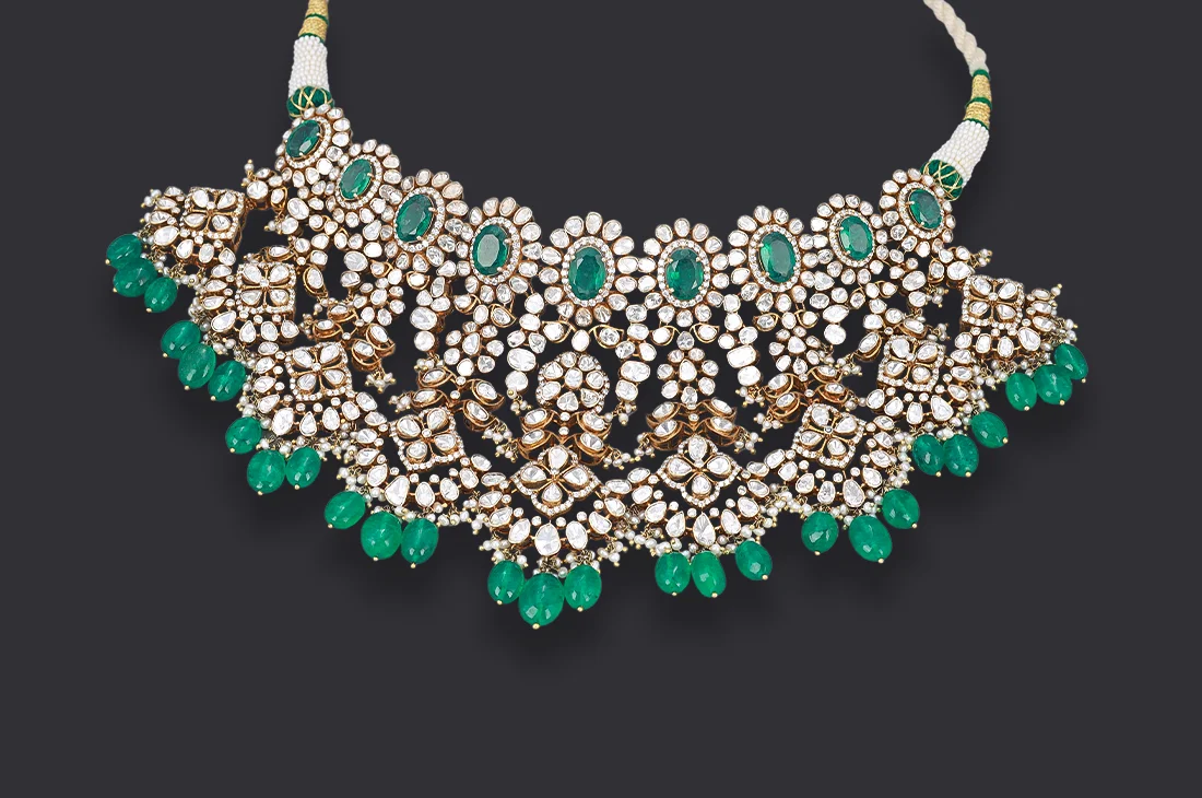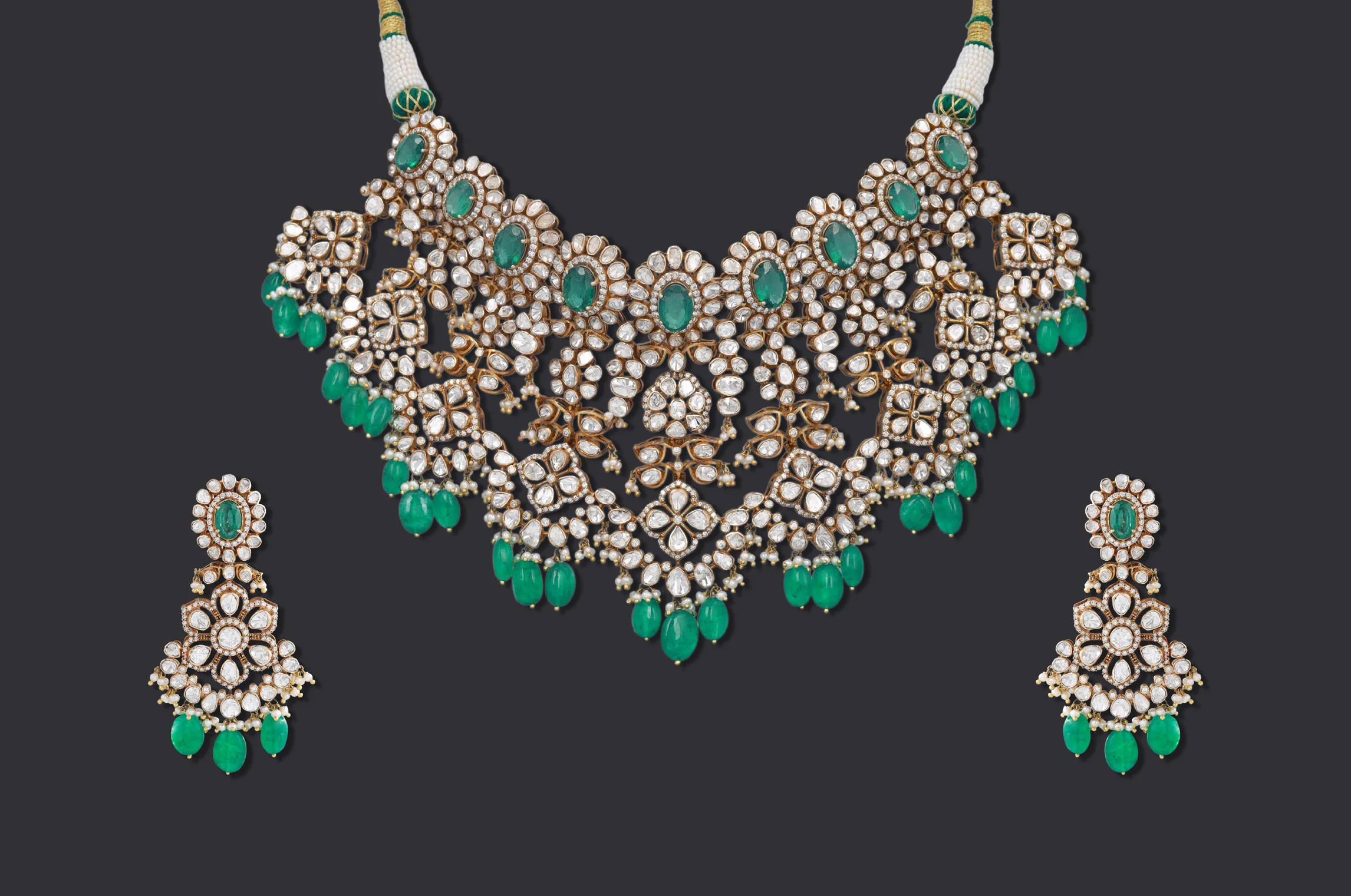 An ornate composition of Polki diamonds and vivid emeralds unfolds in floral and lattice-inspired patterns, meticulously handcrafted into a silhouette of grandeur. Finished with emerald drops and paired with coordinated earrings, the set celebrates heritage artistry at its most opulent, created to honor the bride’s most radiant moment.