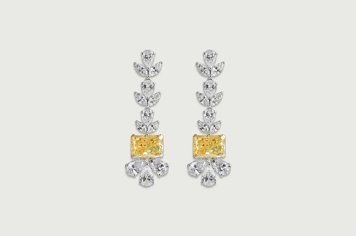 A radiant yellow lab-grown diamond rests at the centre of a cluster of pear and marquise diamonds arranged in soft floral geometry.