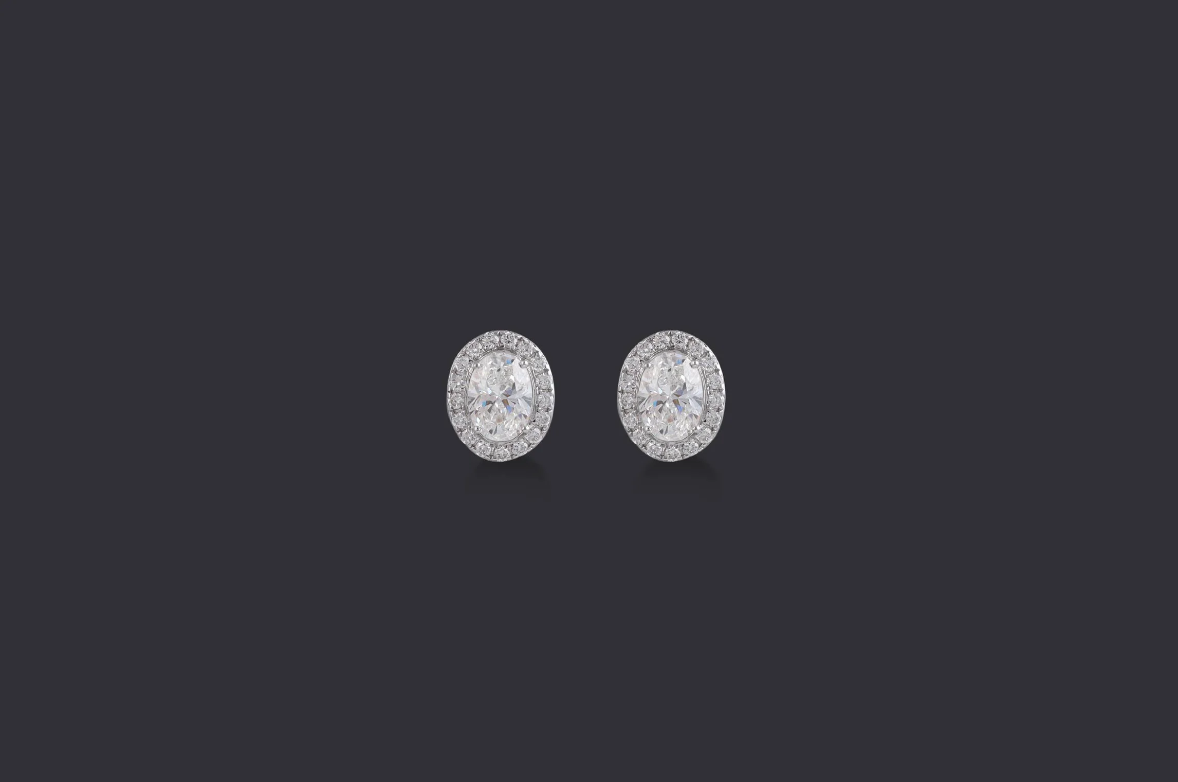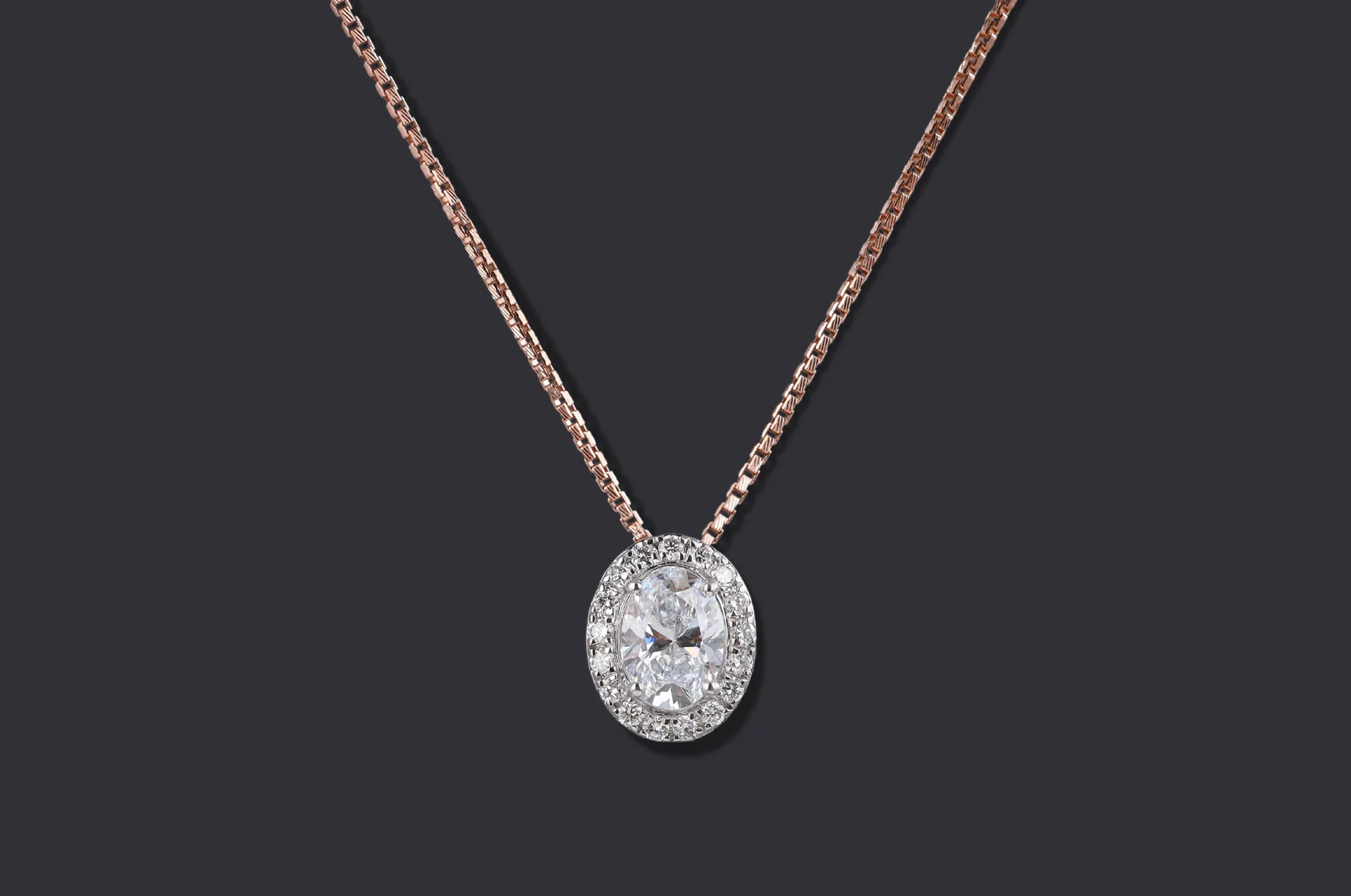 An oval-cut lab-grown diamond radiates from the center, haloed by a constellation of pavé diamonds. Its elongated shape adds refinement while enhancing brilliance, framed on a fine rose-gold chain. A classic silhouette reinterpreted for today, it speaks of permanence and quiet power; versatile enough for layering yet striking on its own.
