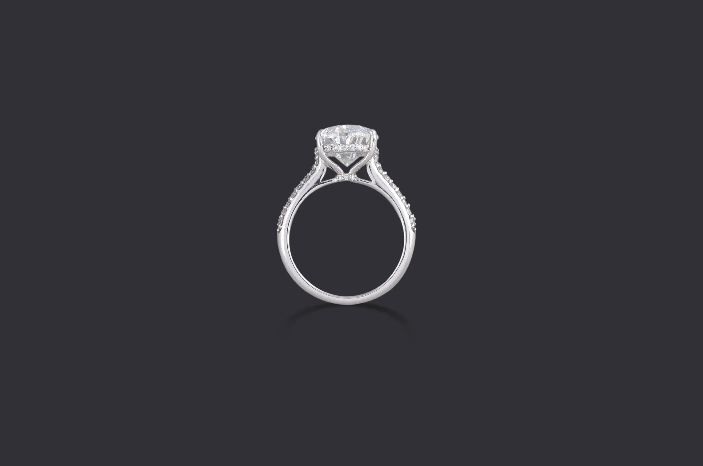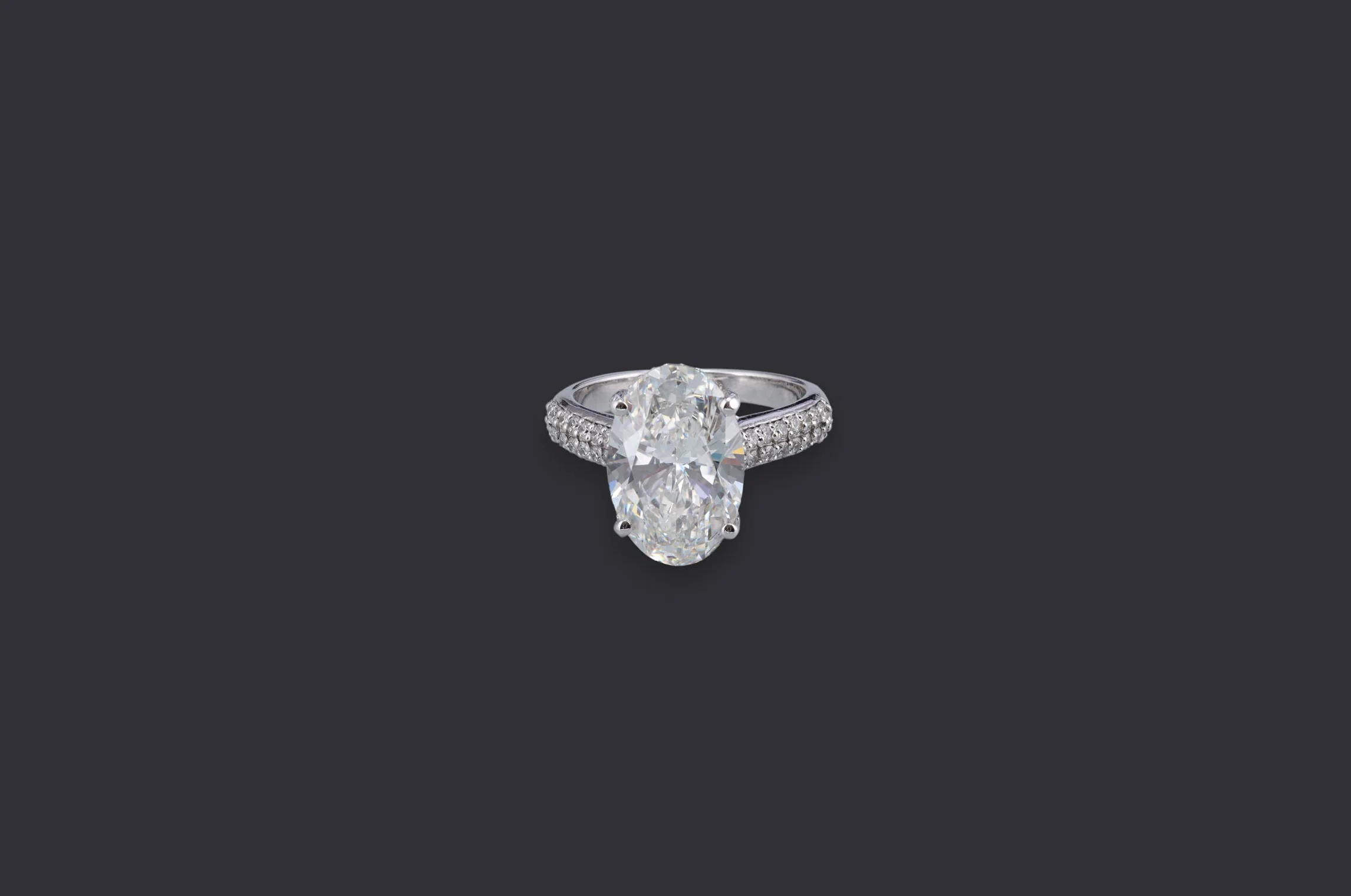 An elongated oval-cut lab-grown diamond sits gracefully atop a pavé white gold band, its facets catching every angle of light. Feminine, elegant, and luminous, this ring epitomises understated grandeur, making it a true modern heirloom.