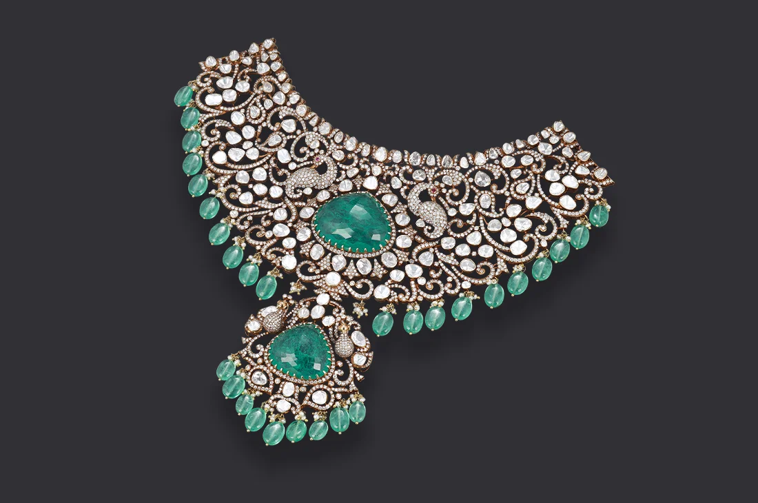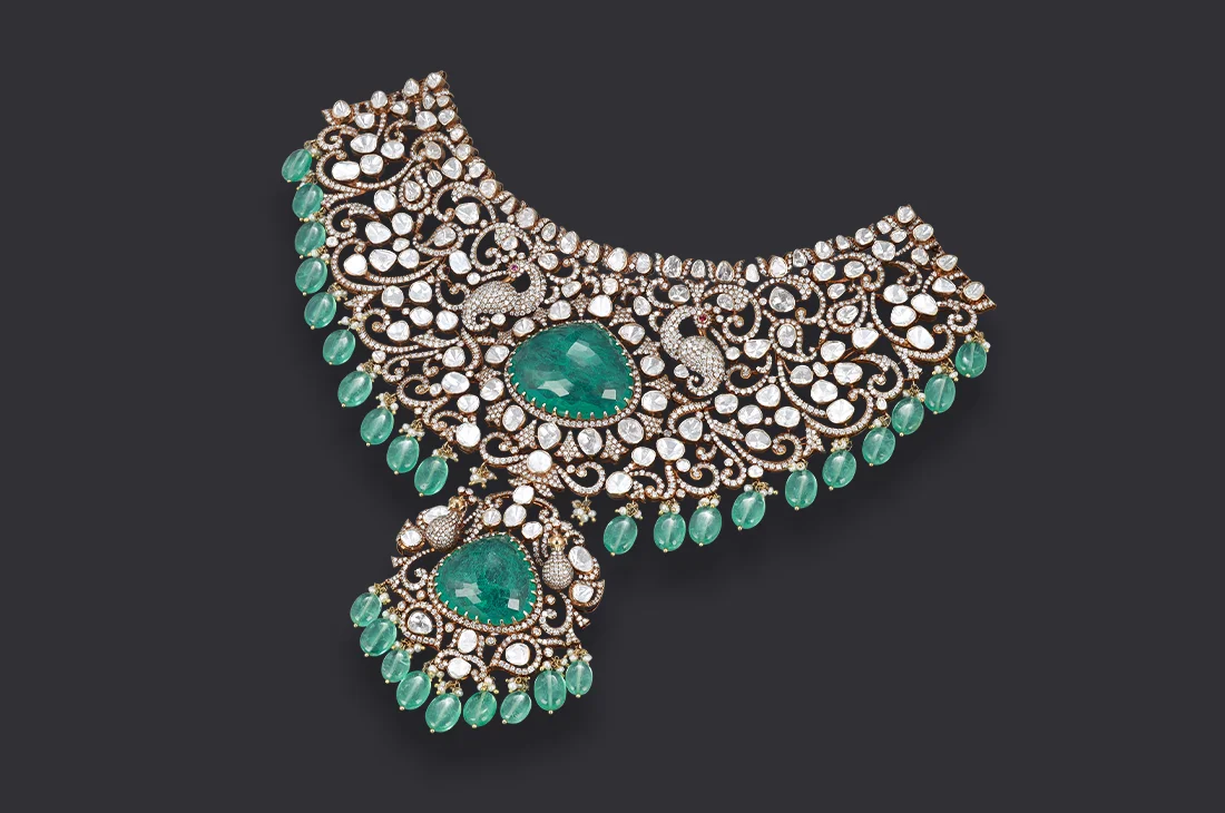 An opulent symphony of lab-grown Polki diamonds and faceted lab- gorwn emeralds, this bridal necklace celebrates grandeur through intricate peacock motifs. The design fuses heritage symbolism with masterful craftsmanship, where every curve reflects artistry and every gem radiates brilliance. Paired with elaborate earrings, it is a jewel of bridal royalty—crafted to honor tradition while embracing the innovation of modern heirlooms.