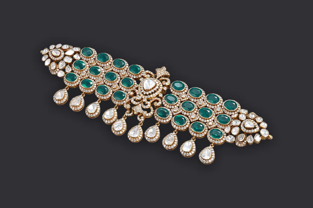Layers of Polki diamonds and emerald drops flow seamlessly across the neckline, forming a rhythmic cascade of brilliance. The interplay of curves and clusters lends movement and depth, celebrating traditional craftsmanship in a contemporary silhouette. Coordinated earrings complete the set, making it a jewel of celebration and legacy.
