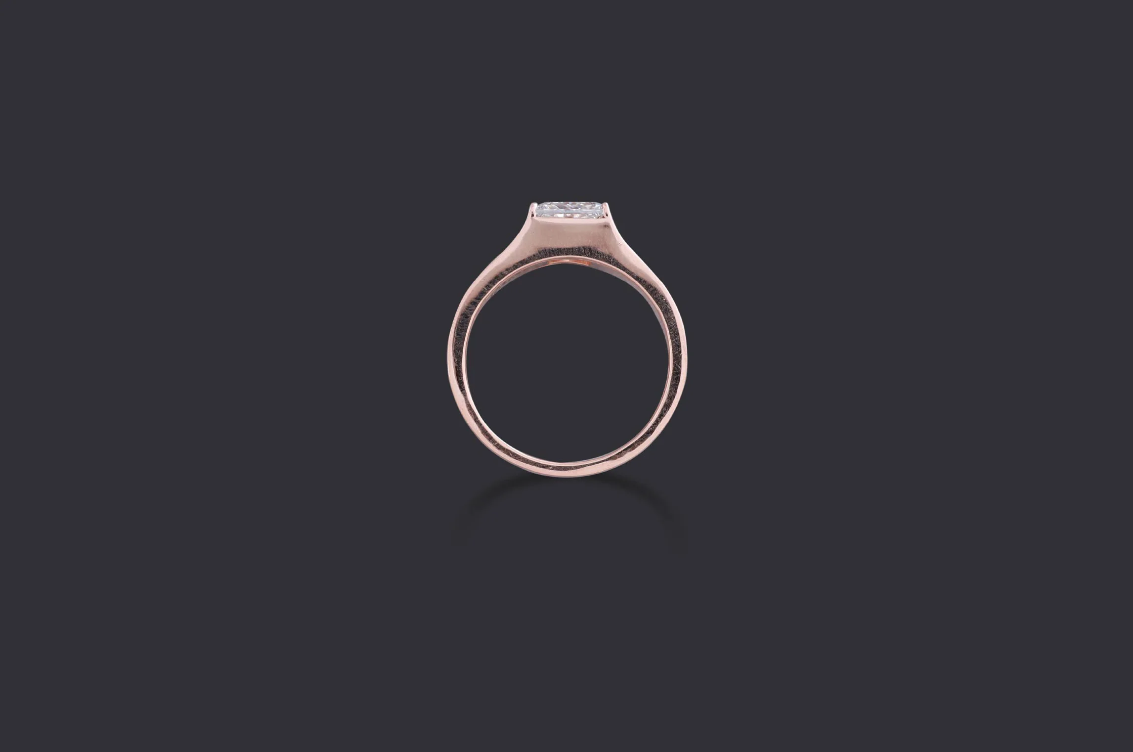 Confident and refined, this rose gold band showcases a princess-cut lab-grown diamond in a structured half-bezel setting. Its clean lines and bold form create a timeless emblem of masculine sophistication and lasting devotion.
