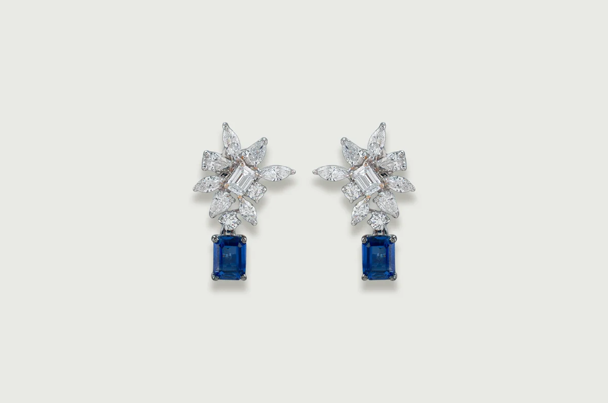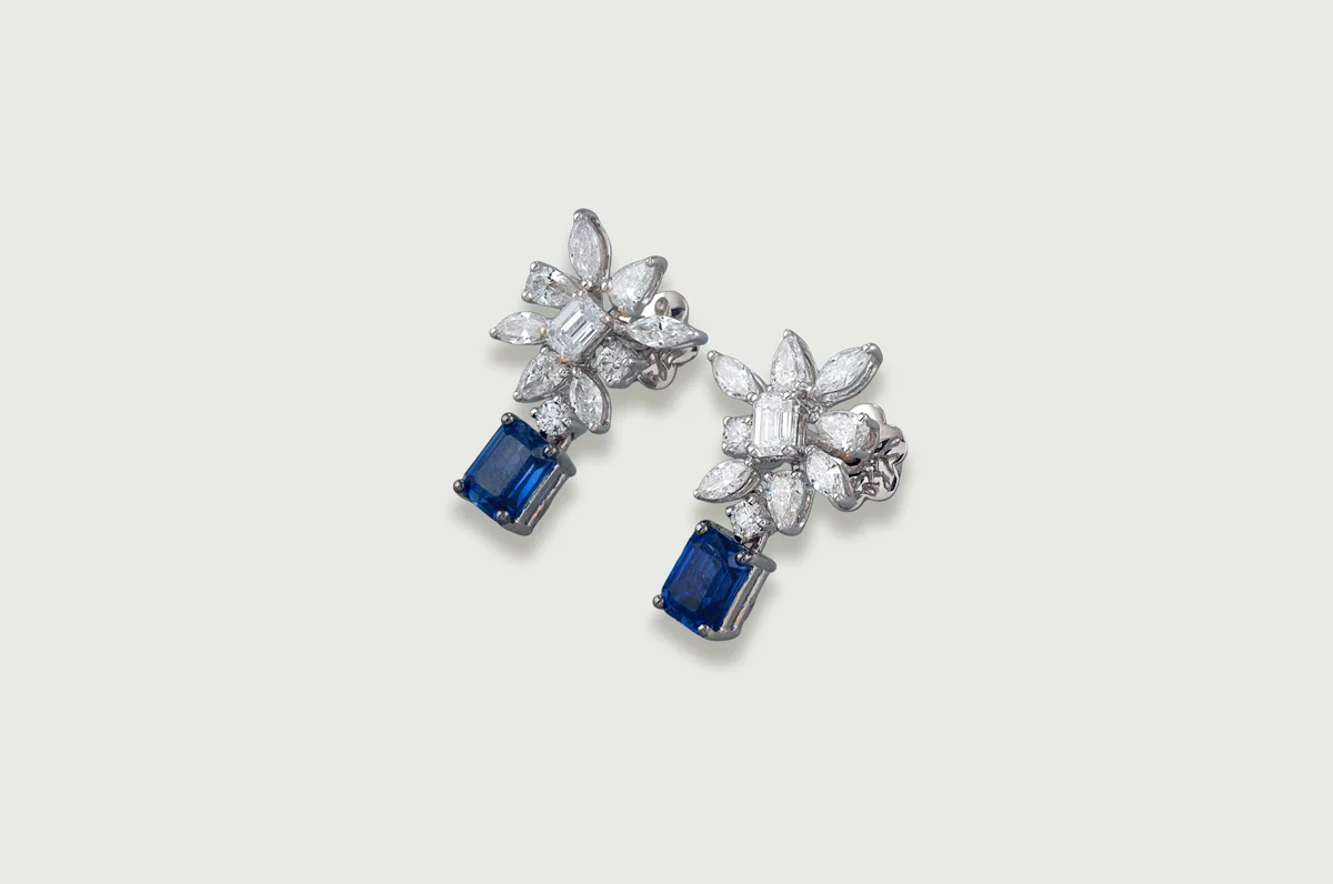 A linear cluster of marquise and baguette diamonds meets a vivid emerald-cut lab sapphire, creating a striking vertical silhouette. Designed for fluid movement and effortless sophistication.