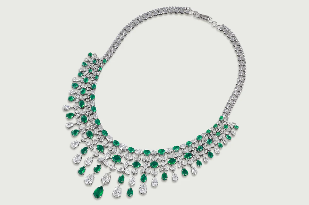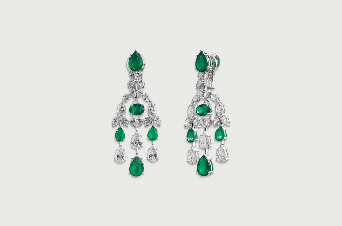 Oval and pear-cut emeralds are suspended among cascading diamonds, creating a delicate interplay of light and colour.