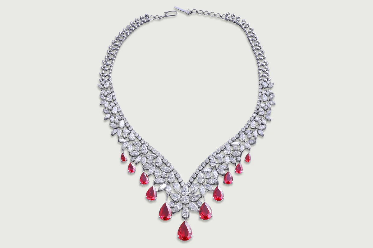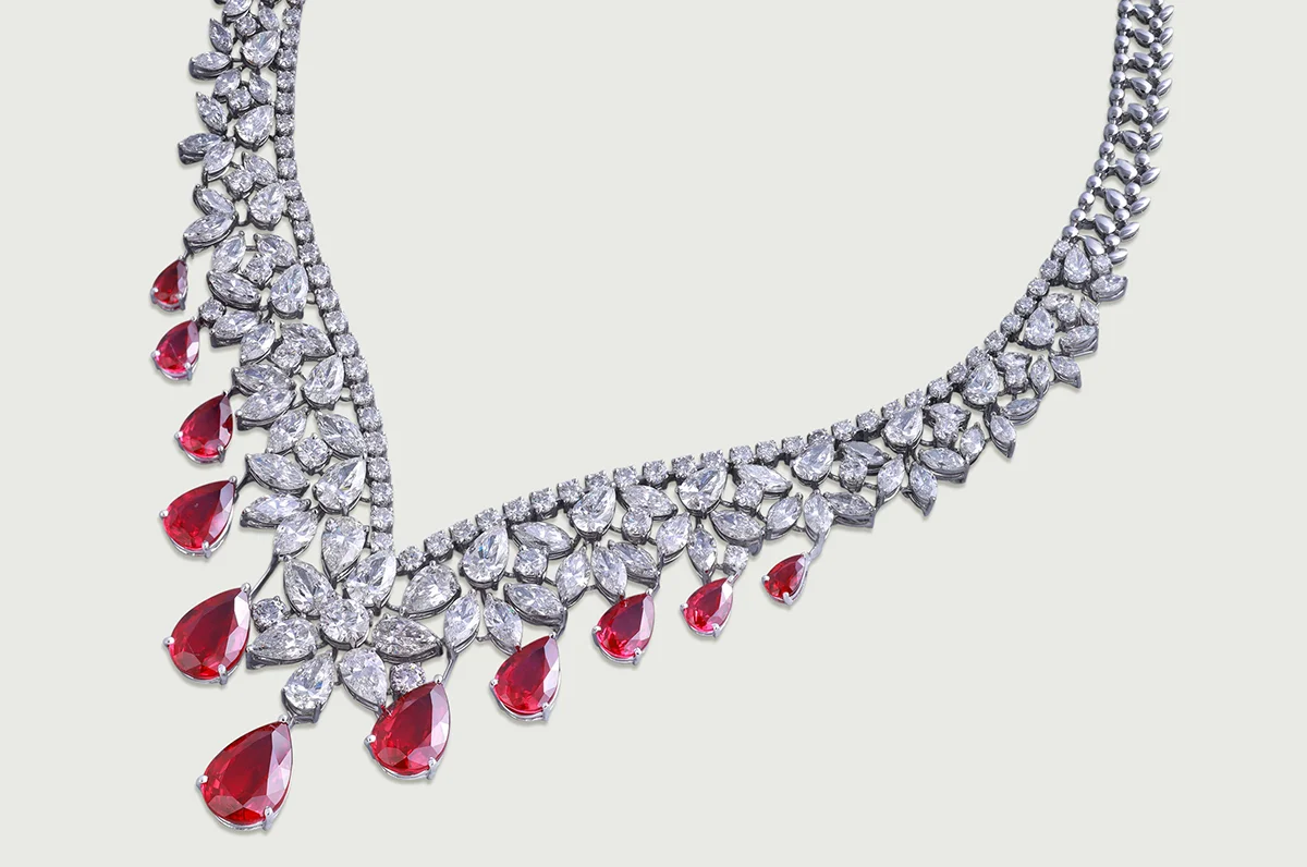 Pear-cut Lab-grown rubies fall between sculpted clusters of white diamonds, creating a gentle, glowing descent.