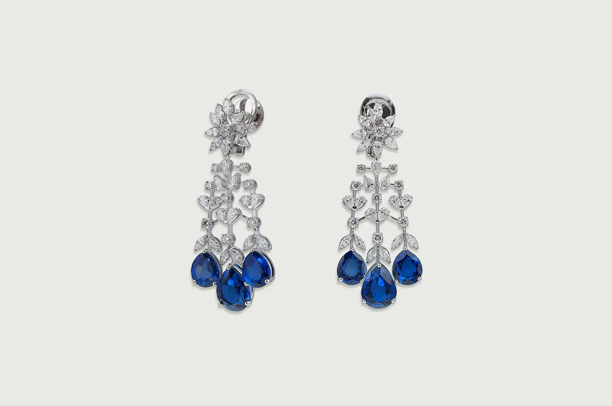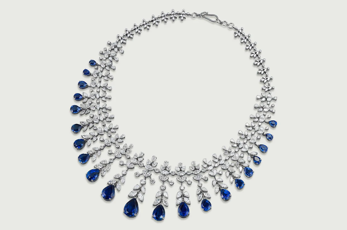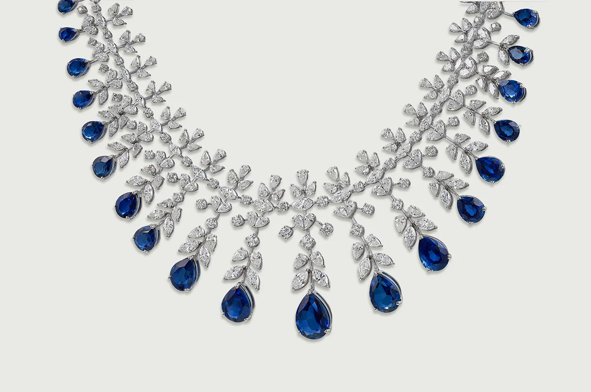 Pear-shaped sapphires punctuate a lacework of marquise and round diamonds, forming a rhythmic, evening-blue cascade.