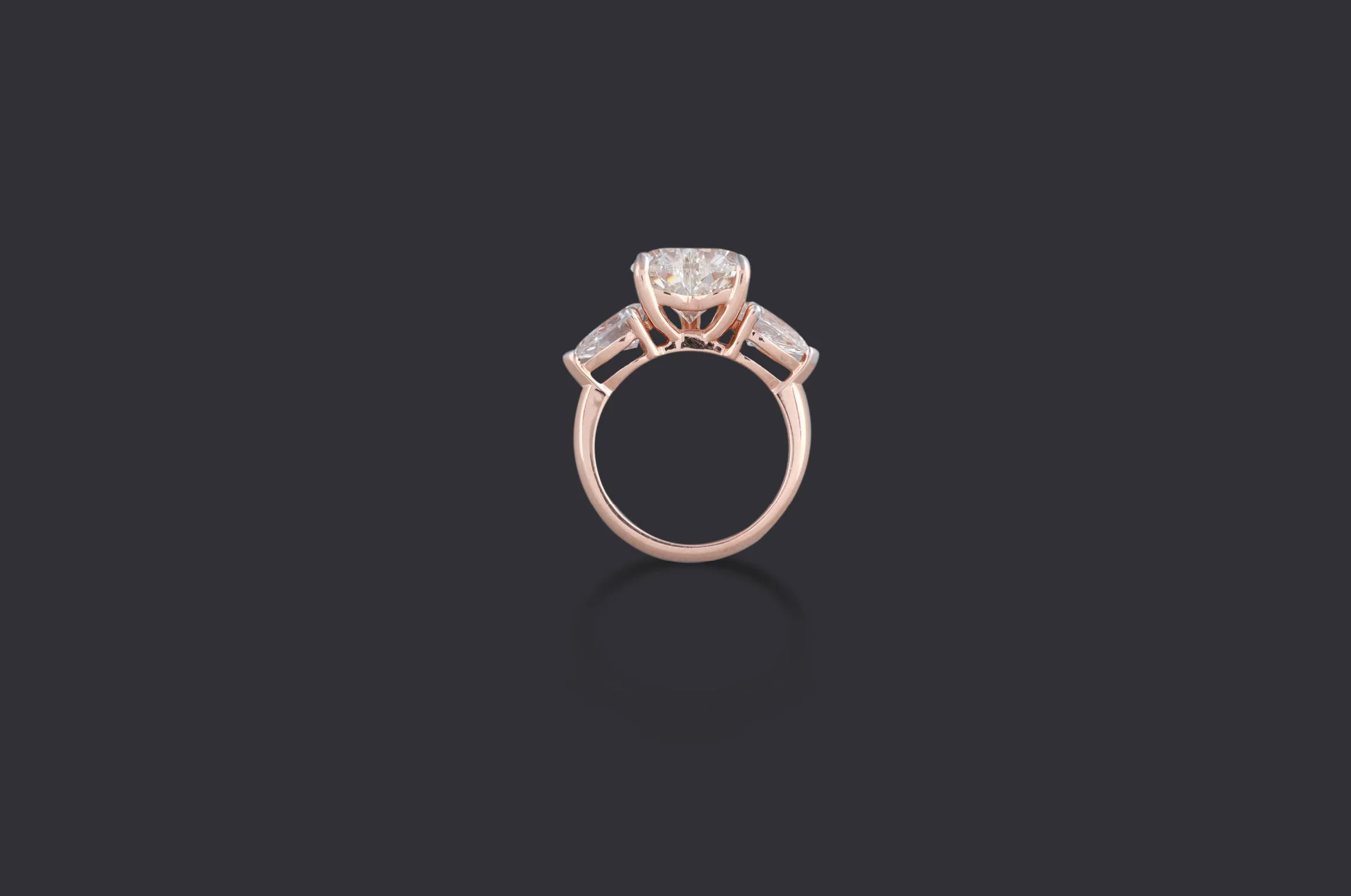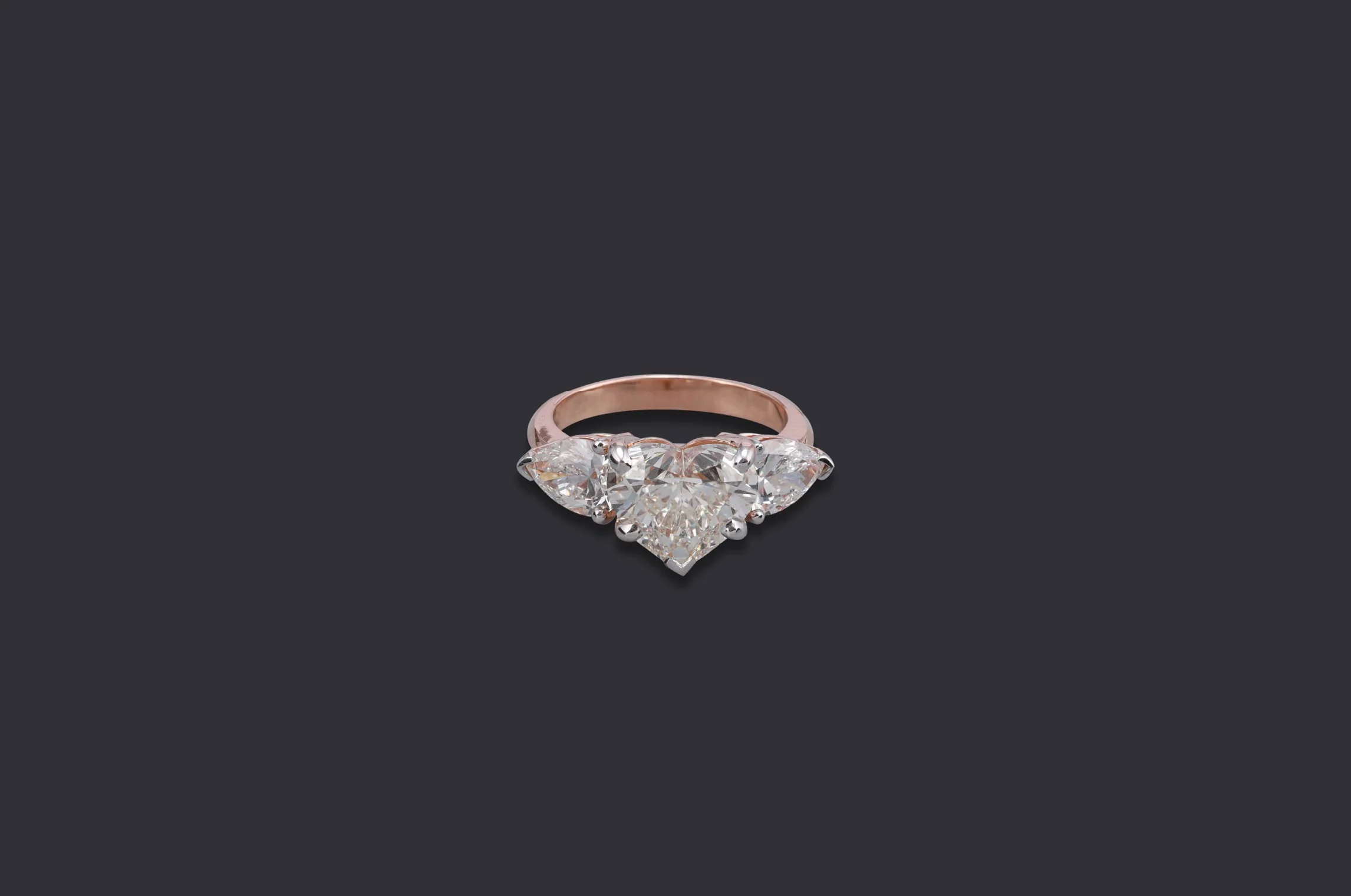 At its centre, a heart-shaped lab-grown diamond radiates with brilliance, flanked by two pear-cut stones on a rose gold band. A bold yet tender design, symbolising past, present, and future — a heartfelt engagement ring to mark life’s most important “yes.”