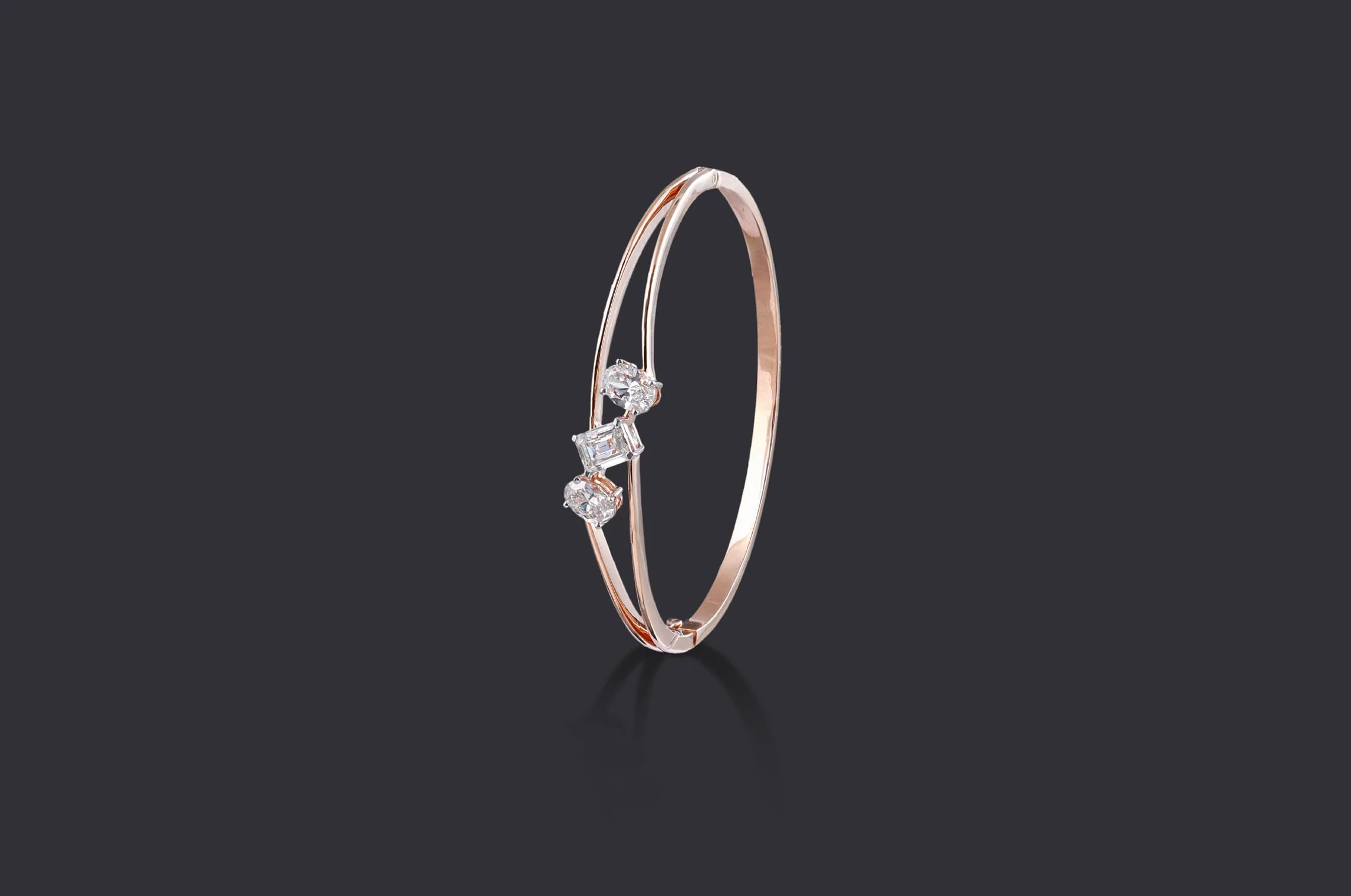 Minimalism meets artistry in this open oval bangle crafted in rose gold. At its center, two oval brilliant diamonds flank a striking emerald-cut diamond, symbolizing balance between fluidity and structure. A modern essential that slips seamlessly from workwear polish to evening allure.
